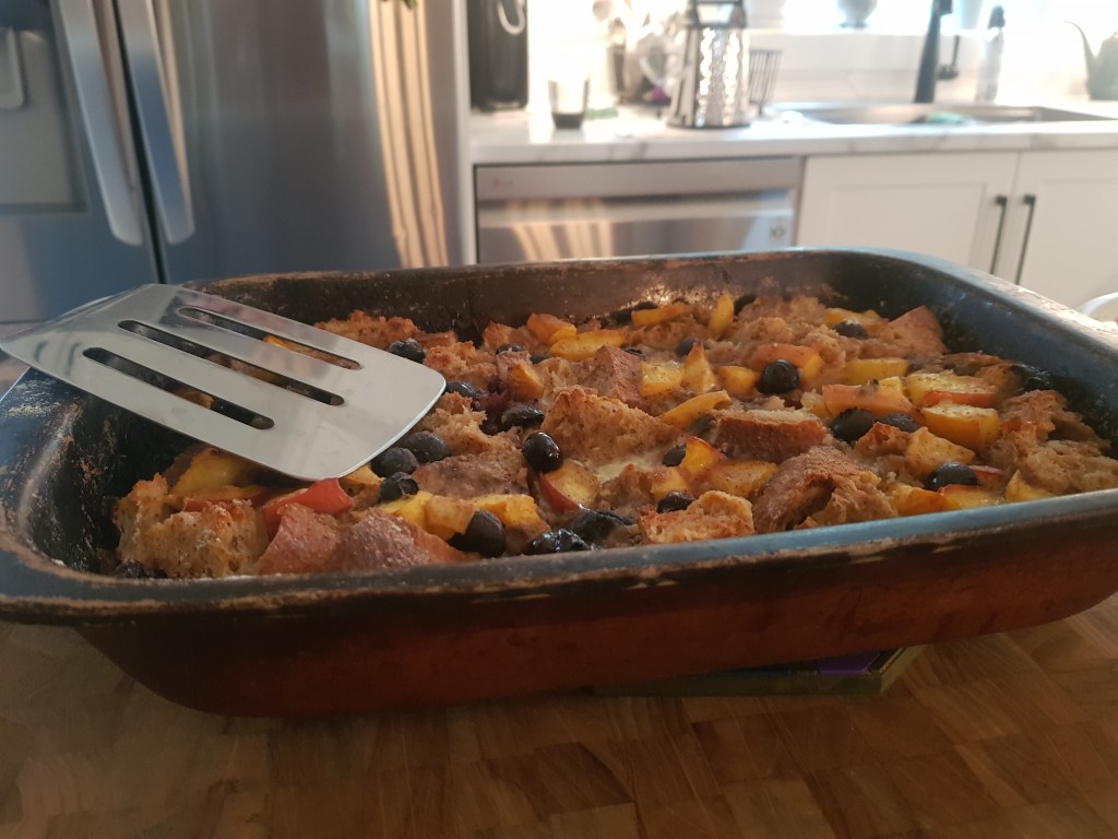 Prompted by the question of what to do with half a loaf of sourdough bread from the legendary Georgetown Bakery that had started to lose its freshness, I discovered this delicious and indulgent baked French toast recipe. As seems the norm these days, I never follow the recipe exactly: In place of some of the sugar, I add some mashed ripe banana, and add some blueberries and peaches (when in season) for some added nutrients and color. I typically serve it with some extra fresh fruit, yoghurt and/or cream and a drizzle of maple syrup. Enjoy!