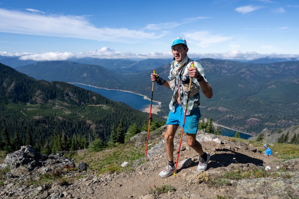 Cascade Crest 100: Nearing the summit of Thorpe Mountain, and The Finish Line hug